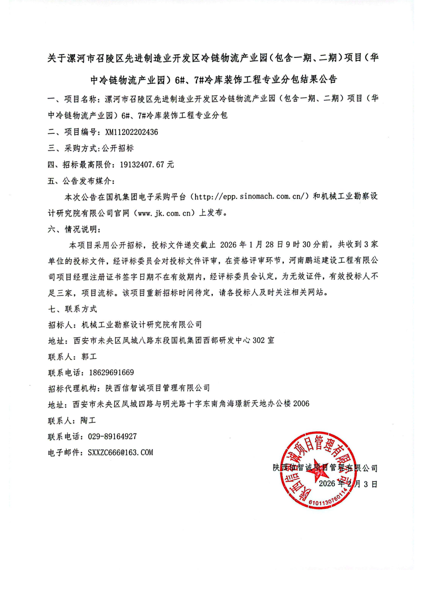 漯河市召陵区先进制造业开发区冷链物流产业园(包含一期、二期)项目(华中冷链物流产业园)6#、7#冷库装饰工程专业分包结果公告