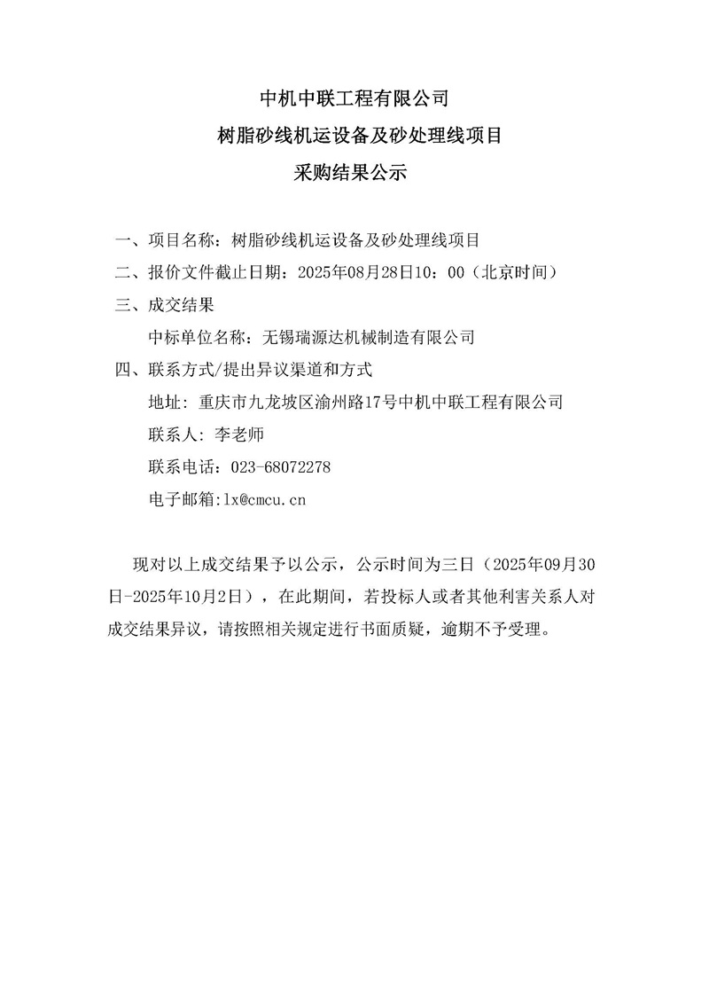 树脂砂机运设备及砂处理线中标结果公示